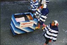 Das Wohngebiet in Haltingen-Ringstrasse, Unterwerkstrasse und Im Rad bis 1956 auch bekannt als Kolonie A, B, C und D, liegt heute abgelegen und ist nur über eine Brücke zu erreichen. Die Freizeitangebote waren früher wie auch heute gleich null. aus dieser Not heraus organisierten 12 Väter, um ihren Kindern etwas Abwechslung zu bieten. einen Hemdglunkiumzug. Am 17. Februar 1977 trafen sich viele kleine und grosse Narren zum 1. Hemdglunkiumzug in der Unterwerkstrasse. Gross war der Zug, der angeführt von der Guggemusik "Notehobler", durch die ehemalige Kolonie zum "Hundehüttli", dem Vereinsheim des Gebrauchshundevereins Haltingen zog. Dort bekam jedes Kind einen Klöpfer mit Weckli. Angespornt durch diesen ersten grossen Erfolg beschlossen die Organisatoren, jedes Jahr einen Umzug durchzuführen. Was sich so zu dem Fasnachtsereignis in Haltingen entwickelte. Um sich auch rechtlich abzusichern, wurde im Jahre 1978 die Interessengemeinschaft "12 Glunki" ins Leben gerufen. Die Väter der ersten Stunde waren: Walter Böhringer, Konrad Brüstle, Karl Denz, Heinz Eckert, Karl Mayer, Klaus Morlock, Udo Messmer, Fritz Kindervater, Heinz Klosterhuber, Ernst Schmidt, Volker Witkowiak und Werner Woyda. Als 1. Vorsitzender und somit Oberglunki wurde Volker Witkowiak ausgewählt. Schon 1980 wurden die 12 Glunki als Gastclique in die Narrenzunft "Wiler Zipfel" aufgenommen. 1981, beim 5. Hemdglunkiumzug, stellten die 12 Glunki ihr Häs vor, welches in der damaligen Form auch heute noch getragen wird. Im Jahr 1989 wurde aus der Interessengemeinschaft ein eingetragener Verein und der Name in 12 Glunggi geändert und sie wurden als Vollmitglied in die Narrenzunft aufgenommen. Das Häs wurde mit einer Holzmaske vervollständigt. Der Hemdglunkiumzug hat auch nach 20 Jahren noch nicht an Attraktivität verloren. Der Andrang wurde so gross, dass das "Hundehüttli" zu klein wurde. Schweren Herzens entschlossen sie sich, den schon historischen Umzugsweg durch die ehemalige Kolonie aufzugeben und ab 1992 endet der Hemdglunkiumzug in der Festhalle. Die 12 Glunggi pflegen das Brauchtum der alemannischen Fasnacht und nehmen an Umzügen in der näheren und auch weiteren Umgebubg teil. Hauptanliegen ist aber weiterhin der Hemdglunkiumzug in Haltingen. Die Hälfte der aktiven Mitglieder sind heute Jugendliche und Kinder. Seit ihrem Bestehen fühlen sich die 12 Glunggi der Behinderten - und Altenpflege der AWO weil am Rhein - Haltingen verpflichtet und unterstützen sie mit Geld- und Sachspenden.
