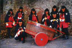 Aus der Lällegeischter - Clique, einer gemischten Gruppe, wollten fünf Männer eine neue Clique gründen und zwar eine reine Männerclique. Nach vielen Diskussionen und Beratungen war es endlich soweit. Im Jahre 1976 wurde die Clique in Anlehnung an das ehemalige Schloss Oetlikon, das auf der heutigen Gemarkung Friedlingen stand, gegründet. Erstmals erwähnt wurde das Schloss Oetlikon im Jahre 1280. Es stand ungefähr auf der Höhe der jetzigen Firma Lonza. Beim Erdbeben am 18.10.1356 wurde auch das Schloss Oetlikon zerstört, Münch von Münchhausen baut es wieder auf und verkaufte es 1368 an die Markgrafen von Rötteln-Sausenburg, die es ihrerseits an die Herren von Bärenfels, dann an die Familei Von Rotberg weiter veräusserten. 1445 wird Schloss Oetlikon von den Eidgenossen zerstört, als sie von einem Beutezug gegen den Breisgau zurückkehrten,weil sie vom Ritter von Bärenfels aufs Übelste beschimpft wurden. Sie plünderten es aus und steckten es in Brand. 1561 wurde es wieder aufgebaut und von den Herren von Rotberg bewohnt. Von ihnen ertauschte der Markgraf Friedrich V. 1640 das Schloss gegen das Dorf Hertingen. Die Schäden des 30jährigen Krieges werden beseitigt und das Schloss zum Andenken an den westfälischen Frieden (1648) in Friedlingen umbenannt. Inder Schlacht von Friedlingen am 14. Oktober 1702 wird es dann völlig zerstört. Das Wappen auf dem Häs ist das Familienwappen der oben erwähnten Herren von Rotberg, deren Nachkommen heute in Rheinweiler wohnen. Vor über 10 Jahren wurde es den Schlössliwächtern erlaubt, dieses Wappen zu tragen. Auch über das ganze Jahr ist die kleine Clique mit der grossen Tradition überaus aktiv. So hatte man bis vor Kurzem jedes Jahr beim grossen Buurefasnachtsumzug einen eigenen Sujet-Wagen. Doch das Pech klebte ihnen förmlich an. Zuerst wurde der Anhänger von Unbekannten gestohlen, dann gab der altersschwache Traktor seinen Geist auf und zuletzt mußte nun auch noch der Cliquenschopf aufgegeben werden, in dem man immer die diversen Ausrüstungsgegenstände lagerte und sich für den Umzug herrichten konnte. Dies alles bedeutet nun natürlich einen hohen finanziellen Aufwand für die Schlössli-Wächter-Clique. Doch ließ sich die Clique nicht unterkriegen und feiert in dieser Kampagne ihr 25 jähriges Bestehen, an dieser Stelle - Glückwunsch auf die nächsten 25.